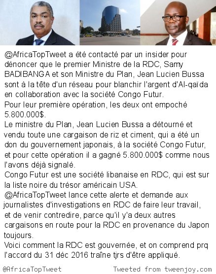 Samy BADIBANGA & Jean Lucien BUSSA à la tête d'un réseau pr blanchir l'argent d'Al-qaïda avec Congo Futur March 11, 2017 Politique A+ A- Print Email LIENS COMMERCIAUX